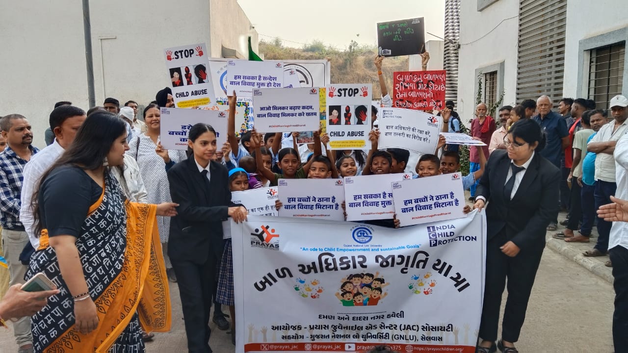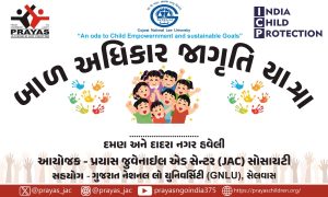 Prayas Juvenile Aid Center Society organized a Child Rights Awareness Yatra in Baldevi, Dadra Nagar Haveli, under the Pradhan Mantri Awas Yojana. Dr. Nandita Gujnani of Gujarat National Law University inaugurated the event and announced free weekend spoken English classes for children. The Yatra raised awareness on child rights, child labor, child marriage, and abuse prevention through posters, banners, and speeches by dignitaries, including Sarpanch Suman Patel and Childline Supervisor Pooja Dewar. The event, held in collaboration with Gujarat National Law University, concluded at the community hall with gratitude expressed by the organizers.